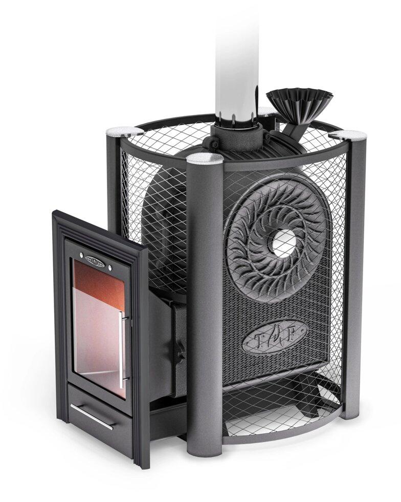 Чугунная печь для русской паровой бани с внутренней закрытой каменкой из нержавеющей стали. От других чугунных печей эту печь отличает, прежде всего, очень большой объем внутренней закрытой каменки, более половины поверхностей которой нагреваются тепловым излучением от пламени, и относительно небольшой объем топки для исключения перегрева парной.